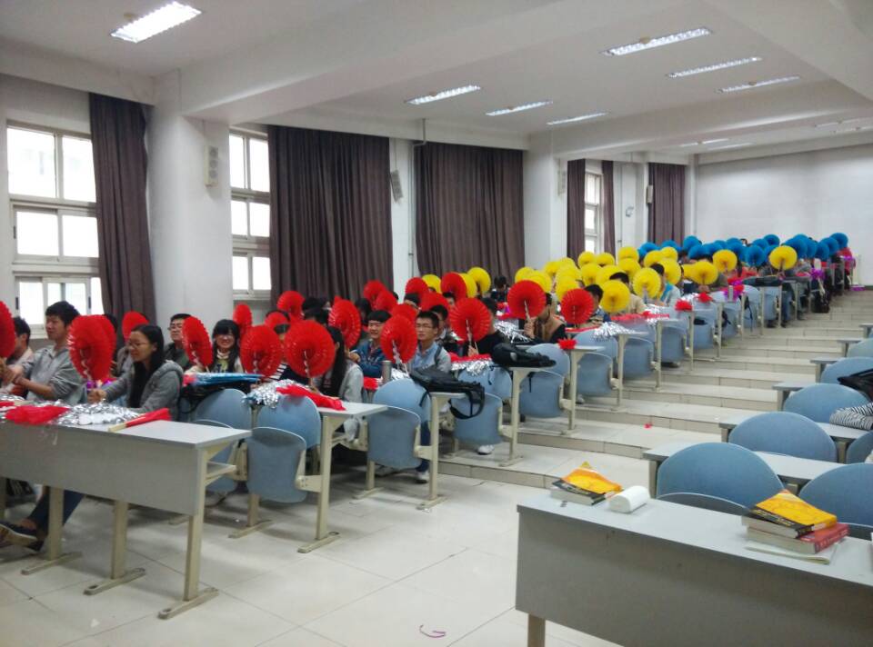 由于天气原因,原定于田径场看台实地彩排的观众团排练不得不转移到三教八阶进行。5月14日上午,生管会工作人员带领着由2013级108名同学组成的002cc白菜资讯观众进行了比赛之前的最后一次排练。